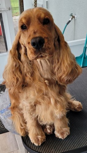 In terms of grooming, while ECS certainly do shed, pets can be shaved down with fringe left on their ears, legs, and body as desired. Expect to need a grooming appointment every 8 weeks. Darker colored dogs tend to grow more coat, and spayed females’ coats can sometimes be coarse and matt more easily. Otherwise, their hair is typically soft and silky. Routine ear cleaning is important, especially keeping the inner flap of the ear and ear canal clear of hair. Some dogs can get lip fold infections. Your dog’s ears fringe will get wet and dirty. If your dog will wear a “snood”, which is a sleeve of cloth that holds their ears back while eating, that will help minimize this problem, but do expect wet ears (and maybe a wet floor) after they’ve had a drink. If paws are not kept trimmed, rainy days will result in more puddles and muddy paw prints.